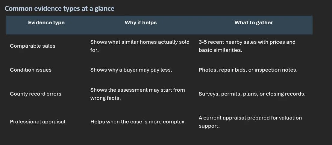 For most homeowners, the best evidence falls into a few familiar categories: recent comparable sales, documented condition issues, corrections to errors in county records, and in some cases a professional appraisal or other supporting documents. The point is not to overwhelm the county with paperwork. The point is to present information that is specific, credible, and tied to value.